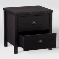 Classic lines with rustic details, the Boston two-drawer nightstand is the perfect place to tuck away your belongings. A welcomed addition to any aesthetic, it showcases a clean-lined frame in a classic finish. Providing ample space for remote controls, books, and any other bedside essentials. The two drawers run smoothly on metal glides, and each one features a gunmetal cup pull handle. Add the matching dressers from this collection to complete your bedroom set.