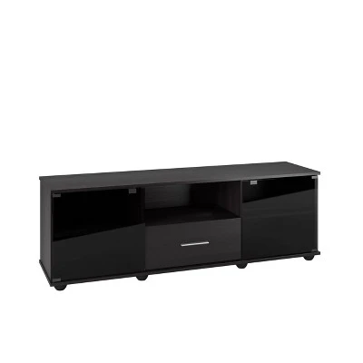 Upgrade your home theater with the TV media stand from the Fernbrook Collection. The wide surface is practical for a mounted or sitting TV. Available in our black faux wood grain finish and accented with metal aluminum handle pull. This bench is a beautiful combination of open and concealed storage space and is built to accommodate most TVs up to 75 inches, a great addition to any living room or entertainment space