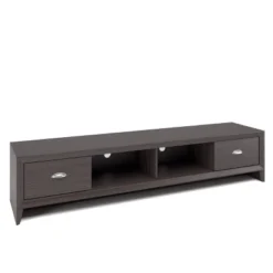 Upgrade your home theater with the TV media stand from the Fernbrook Collection. The wide surface is practical for a mounted or sitting TV. Available in our black faux wood grain finish and accented with metal aluminum handle pull. This bench is a beautiful combination of open and concealed storage space and is built to accommodate most TVs up to 75 inches, a great addition to any living room or entertainment space