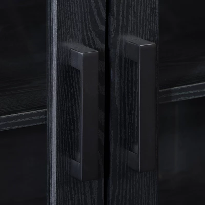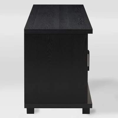 Elevate your entertaining space with this classic TV bench. A beautiful wood grain finish in a rich black, this bench is designed to accommodate all your storage needs. With enclosed shelving areas on both ends and adjustable shelves to fit any and all of your A/V equipment, gaming console and accessory heights. Sit back, relax and control all your equipment from the remote through the framed tempered safety glass doors. Keep your space tidy and organized with center open shelves and cable management openings in each storage area. A classic piece that will truly last a lifetime.