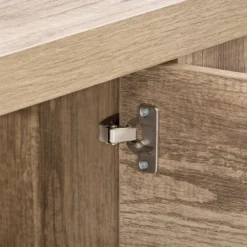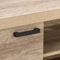 An sturdy and bold design paired with clean lines to complement any room’s décor. With shelving space for all your A/V equipment and accessories, the beautiful duotone cabinet doors with high quality powder coated aluminum handles enclose large storage space on both ends to keep it tidy and organized. Sturdy construction with adjustable center support legs, this bench the perfect design to hold TVs up to 80″. A great focal point in any living room or entertainment space.