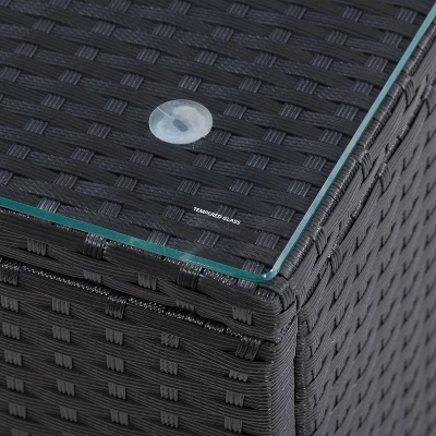Use it as a footrest, put out a spread for guests or simply hold your cold beverage on this multi-faceted coffee table. Stylish and functional, its tempered glass with suction grips, makes sliding a thing of the past while its UV resistant resin wicker maintains a bright and fresh appearance year after year. This piece will complete any patio set and its durable, powder-coated steel frame will stand up against rain or shine.
