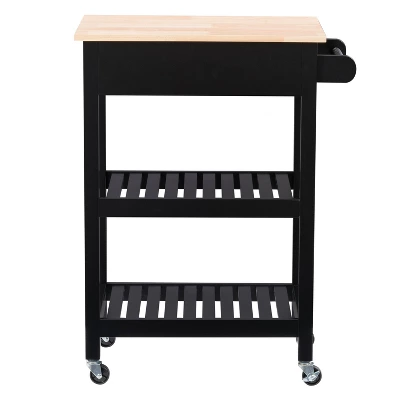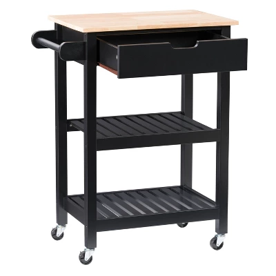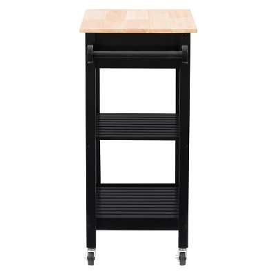 Compact kitchen? No problem! Add extra space to work, serve, and stow away kitchen accessories with this must-have kitchen cart. Its frame is clean-lined and showcases a classic finish to fit in any home’s aesthetic. The top has a neutral wood grain finish and the pinewood legs are supported by four wheels with locking castors so your cart stays in the location of your choosing or can be moved at any time. With lots of open storage and a towel rack, you have ample space to keep all your kitchen necessities within arms reach. Product Dimensions: 33″H x 26″W x 16″D