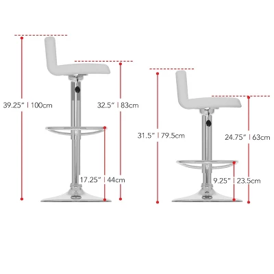 Enhance your kitchen decor with this beautiful pair of low-back adjustable bar stools. The unique padded style and attractive metal base give them a modern and inviting look that matches any decor. The swivel stools are generously padded for your comfort so that you can fully enjoy evenings at your kitchen island with family or friends. The gas spring is easy to access and allows you to adjust the stool to the desired counter height. Product Dimensions: 39″H x 16″W x 18″D