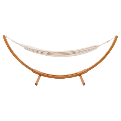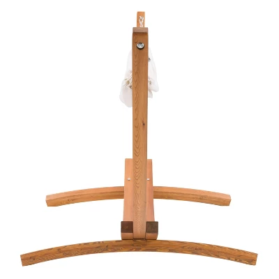 Eye-catching curved solid wood frame sets this Free Standing Sling Hammock apart from the crowd. The larch wood curved stand provides durability and stability and the densely woven cotton hammock is easy to remove for storage. The free-standing design means there is no need for any other support, it’s simple, just place it in your favorite backyard spot and relax!
