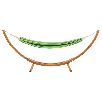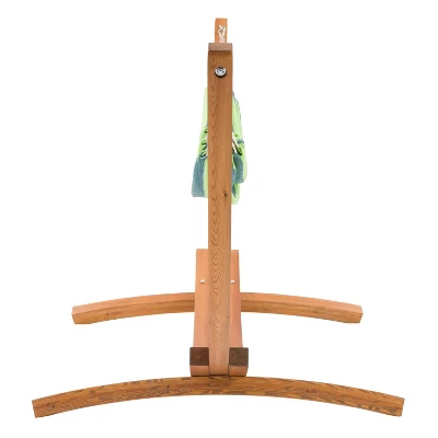 Eye-catching curved solid wood frame sets this Free Standing Sling Hammock apart from the crowd. The larch wood curved stand provides durability and stability and the densely woven cotton hammock is easy to remove for storage. The free-standing design means there is no need for any other support, it’s simple, just place it in your favorite backyard spot and relax!